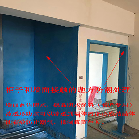 如圖,來看看柜子這里的施工細節(jié)吧!南方潮濕,墻面滲水容易導致貼墻的家具受潮發(fā)霉,而發(fā)霉的家具可能會污染附近的墻面。名匠裝修現(xiàn)場會根據(jù)裝修設(shè)計在柜子和墻面接觸的地方會進行防潮處理,防潮方面采用名匠專用的德高防水涂料,水滲透到墻體內(nèi)會形成結(jié)晶體,能有效防止潮氣,抑制霉菌生長,告別潮濕困擾。